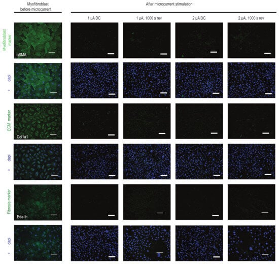 Influence of microcurrent stimulation on myofibroblast phenotype. Immunofluorescence staining for αSma, Cola1a1, and Eda-Fn (green) in myofibroblasts before and after microcurrent treatment with 1 μA/cm2 direct current (1 µA), 2 μA/cm2 direct current (2 µA), 1 μA/cm2 direct current + 1000 s polarity reversal (1 µA, 1000 s rev), and 2 μA/cm2 direct current + 1000 s polarity reversal (2 µA, 1000 s rev). After microcurrent treatment, a reduction in αSma-positive stress fibers and a reduction in the expression patterns of Cola1a1 and Eda-Fn markers in myofibroblasts were observed. DAPI (blue) marks cell nuclei. Scale bars, 100 µm. Colored images show a single channel for the markers (green) and merged images with DAPI (blue).