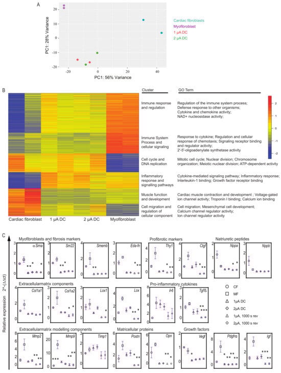 Transcriptome analysis in microcurrent-treated cells. (A) Principal component analysis of gene expression data generated by RNA sequencing from four sample groups: (1) healthy cardiac fibroblasts (CFs); (2) 1 μA/cm2 direct current microcurrent treated myofibroblasts (1 μA), (3) 2 μA/cm2 direct current microcurrent-treated myofibroblasts (2 μA), and (4) untreated myofibroblasts (MFs) (baseline control) (n = 2 for each sample group). The 2D principal component analysis plot presents the intra- and intergroup relationships by showing the first two principal components (PCs) that account for the majority of variation between samples. (B) K-means clustering and functional overrepresentation analysis of significant differentially expressed genes. The results are depicted as a heatmap with 6 clusters and a table listing their functional roles and gene ontology (GO) terms. They are selected from the top 25 terms with significant gene enrichment for each of the six k-means clusters. (C) Relative gene expression levels of myofibroblast markers, fibrosis markers, ECM structure and modeling components, natriuretic peptides, proinflammatory cytokines, matricellular proteins, and growth factors are shown for cardiac fibroblasts (CFs), untreated myofibroblasts (MFs) and microcurrent-treated myofibroblasts (1 μA direct current, 2 μA direct current, 1 μA direct current +1000 s polarity reversal and 2 μA direct current + 1000 s polarity reversal). Relative gene expression levels were quantified using the ∆ct method and normalized to three reference genes (Gapdh and β-Act). All plot graphs present replicates and mean ± SD (n = 3–6). ns < 0.1, * p < 0.03, ** p < 0.002, *** p < 0.001.