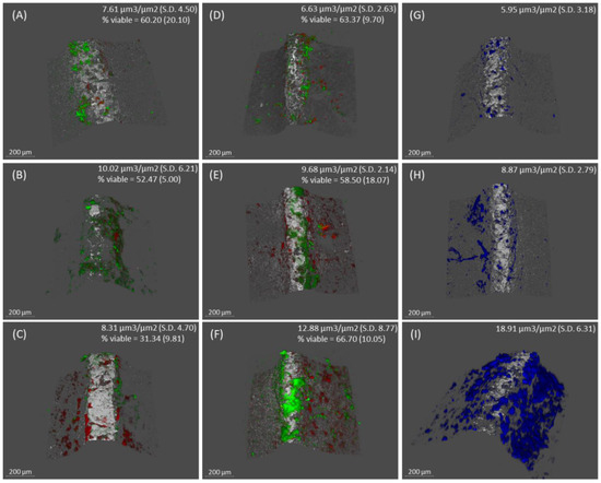 In contrast, the mature biofilms developed in the presence of C. albicans after 72 h of incubation showed higher bacterial biomass than control biofilms (12.88 µm3/µm2 (SD = 8.77) and 8.31 µm3/µm2 (SD = 4.70, respectively)). Furthermore, as seen in Figure 2C,F, and 3, the bacterial viability of the biofilms developed without the fungus was 31.34% (SD = 9.81%), while in the mixed biofilm, it was 66.70% (SD = 10.05%), a difference that was statistically significant (p < 0.05). Figure 2I shows the biomass corresponding to C. albicans, which was 18.91 µm3/µm2 (SD = 6.31).