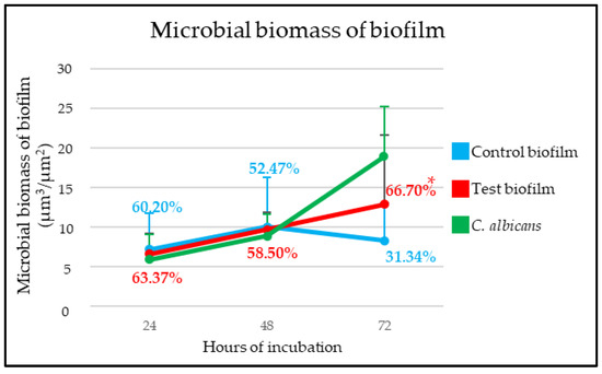 Kinetics of control and test biofilms and Candida albicans [expressed as microbial biomass of biofilm (µm3/µm2)] obtained by quantification of images of confocal laser scanning microscopy (CLSM). Percentages show the proportion of viable cells at each interval of incubation. * p < 0.05, statistically significant differences when comparing test and control biofilms at each time interval.