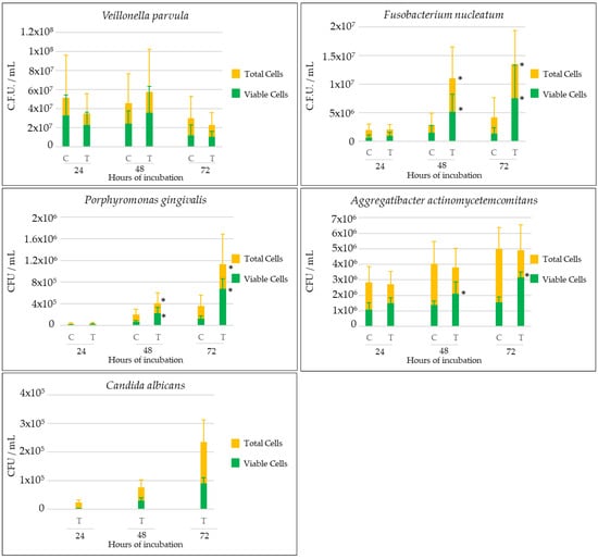 Kinetics (expressed as mean and standard deviation (SD)) of total and live microbial species (colony-forming units (CFUs)/mL) determined by quantitative polymerase chain reaction (qPCR) in 24, 48, and 72 h biofilms on dental implants in the presence (T, test) and absence (C, control) of Candida albicans (n = 9), using specific primers and probes directed to the 16S rRNA gene. * p < 0.05, statistically significant differences when comparing CFU/mL between test and control biofilms at each time interval. Comparisons between groups were performed considering viable cells and total cells. Figure corresponding to Supplementary Table S1.