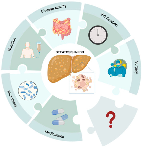 IBD-specific risk factors for liver steatosis. Steatotic liver disease in IBD patients results from a series of factors that are not yet fully elucidated. Drugs, gut microbiota, parenteral nutrition, disease activity, and duration, as well as surgical resections, may yield an effect on liver disease, but many questions about liver steatosis pathogenesis in this subset of patients are still unanswered.