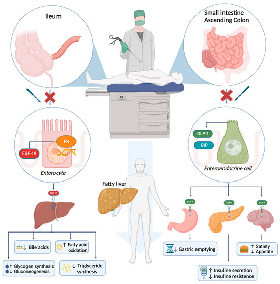 In vivo preclinical studies on mice have demonstrated that small bowel resection is strongly associated with the development of hepatic steatosis [44]. Barron’s experiments in mice showed that small bowel resection was associated with weight gain and a different body composition, with increased fat mass and decreased lean mass. Fasting blood glucose and TNFα levels were also increased. In addition, small bowel resections result in a significant loss of the endocrine component of the intestine. In response to food ingestion, the gut releases the so-called incretins, glucose-dependent insulinotropic peptide (GIP) and glucagon-like peptide-1 (GLP-1), which are hormones that modulate the insulin secretory response. GIP and GLP-1 are produced and released by enteroendocrine K and L cells located in the small intestine and ascending colon. In addition to having effects on pancreatic beta cells, incretins have extrapancreatic effects, such as promoting glucose entry into cells, regulating fatty acid metabolism, inhibiting gastric emptying, reducing food intake, inhibiting glucagon secretion, and a number of other functions [45]. It is credible that the reduction in enteroendocrine K and L cells that occurs following intestinal resections can alter glucose metabolism and promote metabolic syndrome and the development of fatty liver.