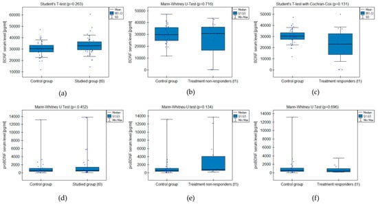 BDNF and proBDNF serum level comparison between the groups: (a,d) studied group before the treatment (t0) and healthy control; (b,e) treatment non-responders after the minimum 6 weeks of treatment (t1) and healthy control; (c,f) treatment responders after the minimum 6 weeks of treatment (t1) and healthy control.