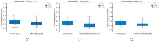 BDNF gene exon IV promoter methylation index (MI) comparison between the groups: (a) studied group before the treatment (t0) and healthy control; (b) treatment non-responders after the minimum 6 weeks of treatment (t1) and healthy control; (c) treatment responders after the minimum 6 weeks of treatment (t1) and healthy control. * Statistically significant difference (p < 0.05).