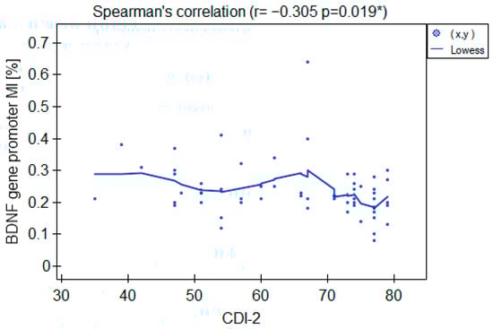 Correlation between the BDNF gene exon IV promoter’s MI and CDI-2 results in the whole sample. * Statistically significant (p < 0.05).