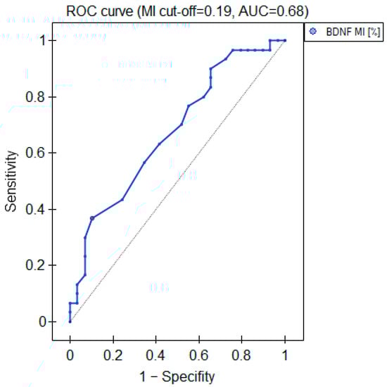The MI within the promoter of the BDNF gene (exon IV) for the first primer version was found to be significantly lower within the group of patients with MDD symptoms before the treatment when compared with the healthy subjects (Figure 2a). There was a significant negative correlation between MI and the level of depressive symptoms within the whole sample (Figure 3). The association between MI and the presence of depression was also significant when controlled for age and BMI in the logistic regression model (β = −9.6; p = 0.031). The diagnostic ability of the test is presented as a ROC curve in Figure 4. The analysis revealed that at the threshold of MI = 0.19, the test distinguished between the subjects suffering from MDD symptoms and healthy controls with a sensitivity of 37% and specificity of 90% (PPV = 79%; NPV = 58%). After treatment, the responders’ MI did not significantly differ from the control (Figure 2c). The MI among non-responders was still lower than that in the controls (Figure 2b) at the threshold of statistical significance (p = 0.051). There were no significant differences between the groups when the second primer version was used in the analysis. There were no significant correlations between the methylation levels in the BDNF exon IV and proBDNF/BDNF serum levels for both primers.