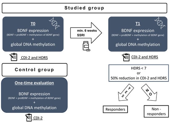 Study scheme: t0—on admission to the hospital before treatment; t1—after a minimum 6 weeks of antidepressant treatment; HDRS—Hamilton Depression Rating Scale; CDI-2—Children’s Depression Inventory; BDNF—brain derived neurotrophic factor; SSRI—selective serotonin reuptake inhibitor.
