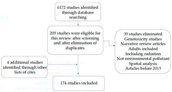 A total of 6172 articles obtained from electronic MEDLINE (PuBMed) databases were retrieved, and an additional 7 were obtained from the lists of citations. Of these, 209 studies were eligible for this review because they fulfilled the inclusion criteria: (1) original or review epidemiological studies assessing the association between environmental pollution and childhood cancer; (2) published between 2013–2023; and (3) with abstracts in English or Spanish. Pollutants were categorized into the following groups: air pollution, pesticides, tobacco and alcohol exposure, indoor chemical exposure, electromagnetic fields, and radon. Studies regarding ionizing radiation from sources different from radon were excluded, as well as studies including populations other than children. Of these, 174 studies were retained after a second manual screening and elimination of studies that did not meet the inclusion criteria or were duplicated (Figure 1). Searching commands and the number of papers found in each search are described in Table 1. Table 2, Table 3, Table 4, Table 5, Table 6 and Table 7 summarize the 174 papers included in this review.