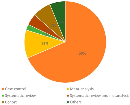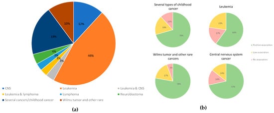 Most studies were case–control analyses—we found 69% of papers in this category—and 18% of studies were meta-analyses, systematic reviews, or both (Figure 2). The most investigated type of cancer was leukemia, accounting for 46% of papers reviewed. We found that 19% of the papers assessed three or more types of cancer, and 12% of papers investigated central nervous system cancer; 10% of the articles assessed Wilm’s tumor, retinoblastoma, hepatoblastoma, and other rare tumors (Figure 3). According to our categorization of results (positive association, low association, or no association with environmental pollution), the type of cancer with the most positive associations (78%) was Wilms tumor and other rare tumors, and the type of cancer with the lowest percentage of positive associations was leukemia, in which 60% of studies showed positive associations and 23% of the studies showed negative associations with environmental pollution (Figure 3). We found that 12% of studies analyzed nervous system cancer, and 72% of the studies showed positive associations with environmental pollution.