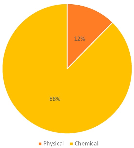 Regarding the type of pollutant, we found that 88% of the investigations assessed chemical environmental factors, and 12% included physical factors such as electromagnetic fields (Figure 4). The most frequent type of environmental factor assessed was air pollution (29%), which included benzene, particulate matter, ultrafine particles, diesel engine exhaust, living in industrially contaminated sites, and living near road traffic. Studies assessing air pollution were followed by studies on pesticides (28%), papers including prenatal or parental exposure to tobacco, alcohol, coffee, and tea (16%), and papers assessing exposure to electromagnetic fields (12%); 11% of the studies assessed indoor chemical exposures (Figure 5).
