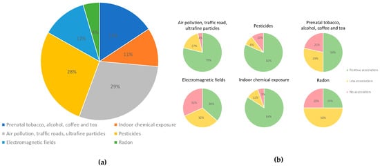 (a) Types of environmental pollutants analyzed in the studies included. (b) The smaller circles show the percentage of papers demonstrating positive (green), low (blue), or no (red) associations with environmental pollution.