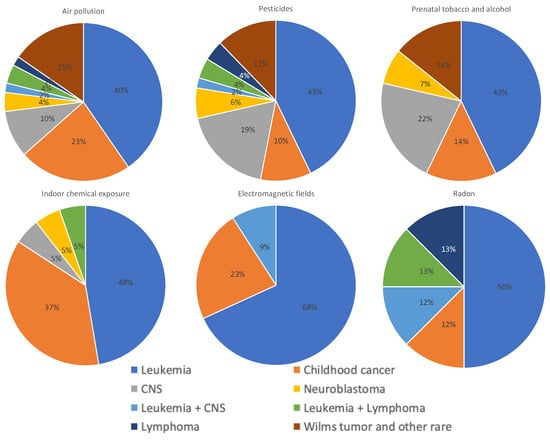 As mentioned above, the type of cancer most frequently analyzed was leukemia, ranging from 68% in studies on electromagnetic fields to 40% in studies on air pollution. For all the pollutants, studies assessing more than one type of cancer have been performed, particularly for indoor chemical exposures (37%). An exclusive analysis of childhood CNS cancer has been included, particularly in studies on prenatal tobacco and alcohol exposure and pesticides. Although no studies were found exclusively assessing Wilms tumor and other rare cancers and exposure to electromagnetic fields or radon, these types of cancers could have been included in studies that investigated more than one type of cancer (category “childhood cancer”) (Figure 6).