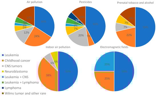 Distribution of types of cancer assessed in studies on air pollution, pesticides, parental tobacco and alcohol, indoor chemicals, and electromagnetic fields exposures. Only studies showing positive associations were included for this analysis.