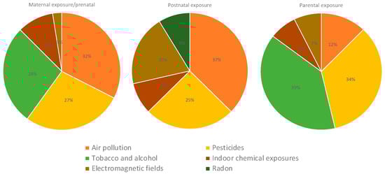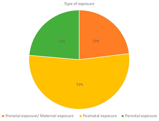 Regarding the type of exposure, most studies included postnatal exposure (53%), particularly studies assessing air pollution and pesticides (Figure 9); 23% of the studies analyzed maternal exposure to contaminants during pregnancy, particularly to air pollution, pesticides, and tobacco and alcohol exposures. Studies investigating parental exposures mostly included studies on pesticides and tobacco and alcohol consumption. Indoor chemical exposures were mostly assessed postnatally (Figure 10).