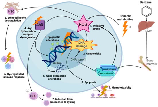 Mechanisms of benzene-induced leukemia. Benzene is metabolized in liver, lung, and bone marrow, producing metabolites which exert different biological effects, including oxidative stress inducing reactive oxygen species (ROS); genotoxicity, including mutations, chromosome breaks, and aneuploidy; and epigenetic changes, dysregulation of aryl hydrocarbon receptor (AhR), alteration of gene expression, and apoptosis. Oxidative stress can dysregulate hematopoietic stem cell (HSC) niche and lead to a dysregulated immune response. Moreover, Ahr disruption can induce HSCs from quiescence (G0) to cycling, leading to hematotoxicity. In combination, these events can lead to leukemogenesis [192]. Created with BioRender.com.