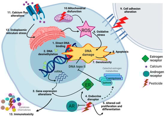 Mechanisms of pesticide-induced cancer. Pesticides such as pyrethroids exert different biological events that can potentially promote cancer. Pyrethroids can bind DNA, induce epigenetic changes, alter gene expression, be endocrine disruptors, alter cell proliferation and differentiation, induce oxidative stress increasing reactive oxygen species (ROS), be genotoxic, induce apoptosis, alter cell adhesion, disrupt mitochondrial function, alter calcium flux, and induce endoplasmic reticulum stress. All these events in combination could drive leukemogenesis [197]. Created with BioRender.com.