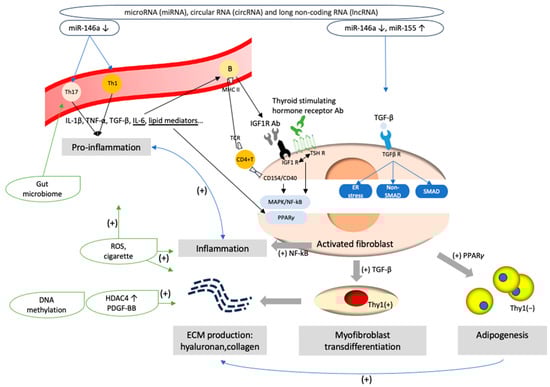 Pathogenesis of Graves’ ophthalmopathy. (1) Aberrant epigenetic modifications, such as dysregulation of microRNA (miRNA)-146, miRNA 155, circular RNAs and long non-coding RNA, might trigger pro-inflammatory cascades and disturb the expression of signaling molecules critical for myofibroblast transdifferentiation and adipogenesis processes in orbital fibroblasts. (2) The interaction through CD40–CD154 ligation and T cell receptor (TCR)–major histocompatibility complex class II (MHC II) ligation activates pro-inflammation and orbital fibroblasts with the secretion of inflammatory mediators, such as IL-1β, IL-6, tumor necrosis factor (TNF)-α, transforming growth factor (TGF)-β, and lipid mediators. Orbital fibroblasts further upregulate the release of pro-inflammatory cytokines. IL-6 modulates B cell immunoglobulin secretion. Autoantibodies of insulin-like growth factor-1 (IGF-1) and thyroid-stimulating hormone receptor antibodies (TSH Ab) interact with their receptors and activate the thyrotropin/IGF-1 receptor complex, promoting the further mitogen-activated protein kinase (MAPK) and nuclear factor kappa-light-chain-enhancer of activated B cells (NF-κB) downstream signaling pathways, which induce orbital fibroblast proliferation and inflammation. (3) The interaction of thyrotropin/IGF-1 receptor complex and lipid mediators upregulates peroxisome proliferator-activated receptor-γ (PPAR-γ) expression, and induce adipocyte differentiation from Thy1 negative orbital fibroblasts. (4) TGF-β binds to its receptors and activates Smad/non-Smad transcription factors. Thy1 positive orbital fibroblasts are activated and result in myofibroblast transdifferentiation. (5) Contents of the extracellular matrix, such as hyaluronan (HA) or collagen, are produced by activated orbital fibroblasts. Aberrant histone modification and DNA methylation, such as the stimulation of platelet-derived growth factor-BB (PDGF-BB) and histone deacetylases (HDAC) 4, would promote the mRNA expression of HA production and pro-inflammation. Factors of adipogenesis, such as prostaglandin D2 (PGD2) and PGJ2, enhance ECM production. (6) Cigarette enhances oxidative stress and upregulate TGF-β1, IL-1β, adipogenesis and the fibrosis-related gene expression in orbital fibroblasts. (7) Endoplasmic reticulum (ER) stress promotes fibrogenesis after the stimulation of TGF-β. (8) The gut microbiome may foster an imbalance in Th17 and T regulatory cells and impact the levels of TSH Ab.