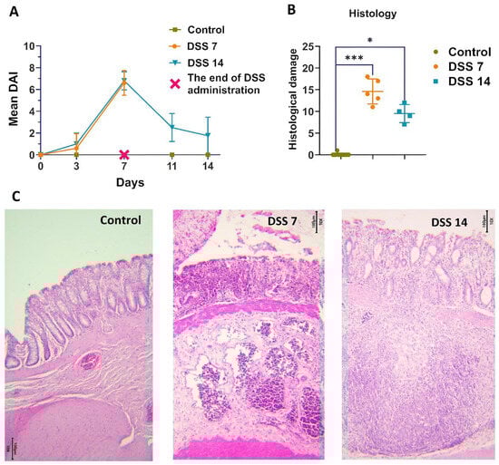 The total score of DAI consisted of body weight decrease, stool consistency, and rectal bleeding [20,23,24]. There was no weight decrease in the control group of the animals or changes in stool throughout the experiment. As shown in Figure 1A, the DAI score was kept close to 0 in the control group during all experimental procedures. There was a noticeable weight decrease in animals on the 3rd experimental day in DSS7 and DSS14 groups. Further, by day 7, weight continued to decrease, the consistency of the stool became soft, streaked with visible blood. The DAI of the DSS-treated groups (DSS7 and DSS14) was significantly higher compared to the control group and increased on day 3. The maximum scores counted for the DSS-treated groups (DSS7 and DSS14) were obtained on day 7 when the acute phase of inflammation was reached.