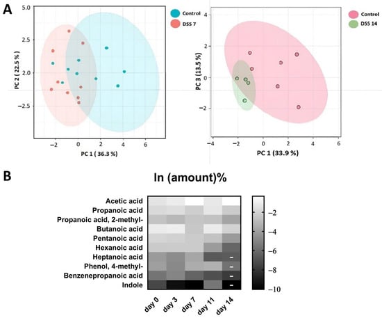 (A). Comparison of VOC metabolomic profiling data using principal component analysis (PCA) between experimental and control groups. (B) Changes in the metabolomic profile during the experiment. Due to their wide range, the data were log-transformed. On day 14, the amounts of metabolites identified in the small number of samples are indicated by dashes and were not analyzed for significance.
