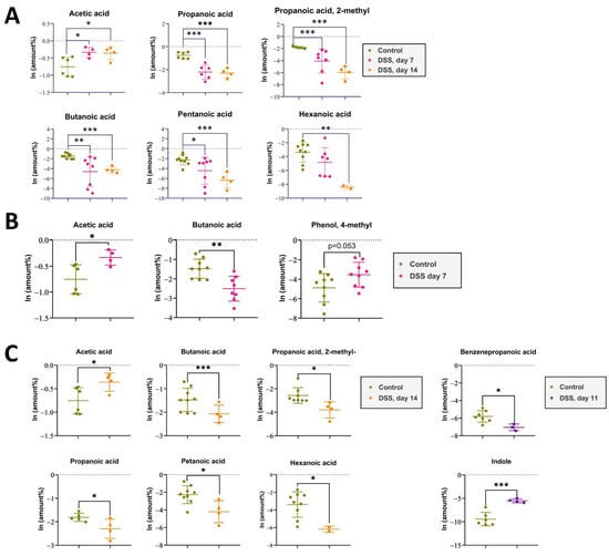 Metabolomic changes continued to increase by day 14. As it can be seen in Figure 3A,C there were significant changes in the metabolomic profile for such compounds as acetic acid, butanoic acid, pentanoic acid, propanoic acid, propanoic acid 2-methyl-, and hexanoic acid, registered in the DSS14 group. Changes in metabolites relative amountsm such as benzenepropanoic acid and indolem were noted on day 11. But, at day 14, significant changes in the mentioned metabolites relative amounts could not be assessed. (Table 1).