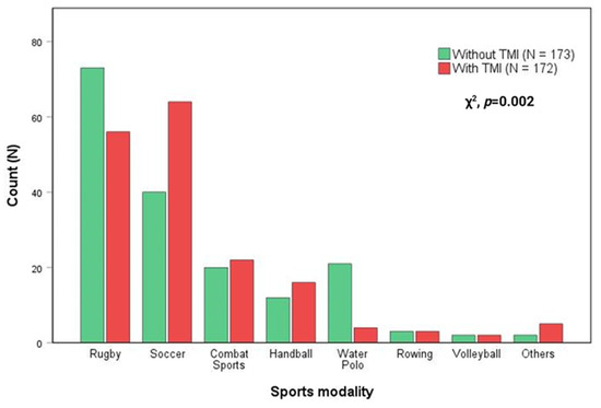 Status of traumatic muscle injury (TMI) across different sports modalities (N = 345). TMI occurrence among high-performance athletes varies significantly depending on the sports modality (Chi-squared test (χ2), p = 0.002).