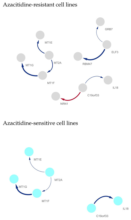 Differentially regulated gene networks between azacitidine-resistant and -sensitive cell lines, where the edge weights are given as the median of the edge strengths in 100 gene networks. The top and bottom indicate the molecular interplay in drug-resistant and -sensitive cell lines, respectively. The edge color indicates sign of the edge weight (i.e., positive—blue and negative—red), A→ B means that gene A regulates its target gene B and the thickness of line indicates the strength of edges. Azacitidine-resistant cell lines show relatively dense gene networks. Notably, the molecular interplay between GRB7, ELF3, and RBM47 exists only in drug-resistant cell lines; thus, their network can be considered to be an azacitidine resistance-specific gene network.
