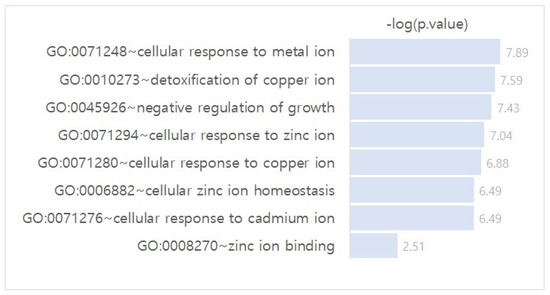 As shown in Figure 2, “GO:0071248: cellular response to metal ion (definition: Any process that results in a change in state or activity of a cell (in terms of movement, secretion, enzyme production, gene expression, etc.) as a result of a metal ion stimulus.)” was the most enriched pathway. Furthermore, “cellular response”-related pathways (“GO:0071294: cellular response to zinc ion (definition: Any process that results in a change in state or activity of a cell (in terms of movement, secretion, enzyme production, gene expression, etc.) as a result of a zinc ion stimulus)”, “GO:0071280: cellular response to copper ion (definition: Any process that results in a change in state or activity of a cell (in terms of movement, secretion, enzyme production, gene expression, etc.) as a result of a copper ion stimulus)”, “GO:0071276: cellular response to cadmium ion (definition: Any process that results in a change in state or activity of a cell (in terms of movement, secretion, enzyme production, gene expression, etc.) as a result of a cadmium (Cd) ion stimulus)”, where the enriched functional-related genes are MT2A, MT1F, MT1G, and MT1E), were identified as crucial biological pathways for azacitidine resistance-specific molecular interplay. The cellular response is a reaction of a cell to extracellular signals. “GO:0071276: cellular response to cadmium ion” was identified as enriched pathway for genes that show different expression levels between AML subgroups and normal bone marrow (BM) [32]. The mechanisms of cellular responses involving resistance to chemotherapy in cancer have been demonstrated in several studies [33,34,35]. Cheng et al. [33] suggested that drug efficacy can be enhanced by Asplatin through altering the cellular response.