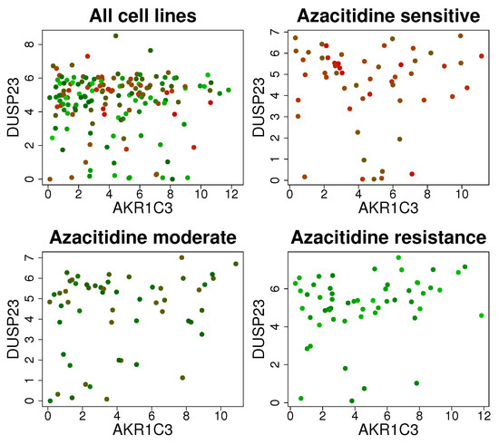 Correlation between two genes (i.e., DUSP23 and AKR1C3) under varying azacitidine sensitivities of cancer cell lines (top left—all cell lines, top right—azacitidine-sensitive cell lines, bottom left—moderately azacitidine-sensitive cell lines, bottom right—azacitidine-resistant cell lines) where the color of dots indicates drug-sensitive (red) and -resistant (green) cell lines.