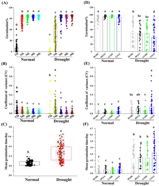 Variation effect of 114 rapeseed accessions at 12, 24, 36, 48 and 60 h of seed imbibition in terms of (A) germination%, (B) coefficient of variance (CV) and (C) mean germination time/day (MGT) under normal and drought stress conditions. Variation among the four seed type groups at 24 h in terms of (D) germination%, (E) coefficient of variance (CV) and (F) mean germination time/day (MGT) under normal and drought stress conditions. The different letters indicate significant differences at p < 0.05 using Duncan’s multiple range tests.