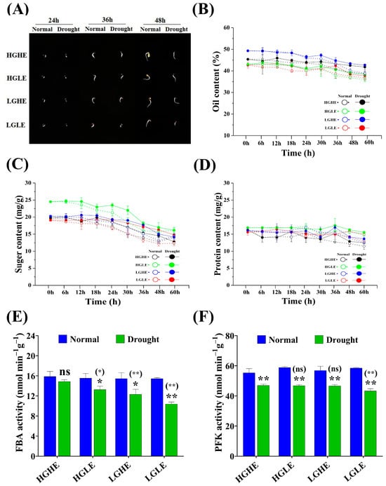 The effect of drought stress on (A) seed germination phenomena, (B) oil content, (C) total soluble sugar content, (D) total soluble protein content, (E) fructose-bisphosphate aldolase activity, and (F) phosphofructokinase activity during the seed germination in four seed type groups of rapeseed. Bars represent ±SE of three replicates. Asterisks indicate significant differences between drought and normal conditions, while asterisks with parentheses indicate significant differences between HGHE and the other three groups under drought conditions (ns: non-significant, * p < 0.05, ** p < 0.01; Student’s t-test).
