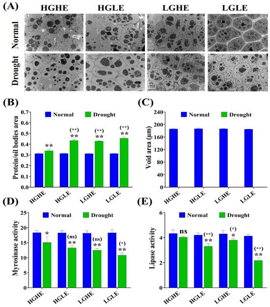 The effect of drought stress on (A) seed ultrastructure, (B) ratio of protein-to-oil bodies area, (C) void area, (D) myrosinase activity, and (E) lipase activity during the seed germination in four seed type groups of rapeseed. Bars represent ±SE of three replicates. Asterisks indicate significant differences between drought and normal conditions, while asterisks with parentheses indicate significant differences between HGHE and the other three groups under drought conditions (ns: non-significant, * p < 0.05, ** p < 0.01; Student’s t-test).