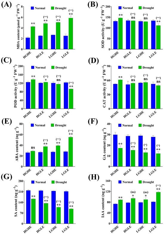 The effect of drought stress on (A) malonaldehyde (MDA) content, (B) superoxide dismutase activity, (C) peroxidase activity, (D) catalase activity, (E) abscisic acid content, (F) gibberellic acid content, (G) salicylic acid content, and (H) indole acetic acid content during the seed germination in four seed type groups of rapeseed. Bars represent ±SE of three replicates. Asterisks indicate significant differences between drought and normal conditions, while asterisks with parentheses indicate significant differences between HGHE and other three groups under drought conditions (ns: non-significant, * p < 0.05, ** p < 0.01; Student’s t-test).