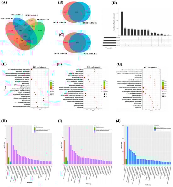 (A–C) Venn diagrams of the differential gene expression between four groups; (D) upset plot of the differential genes related to GSL and EA; (E–G) gene ontology (GO) annotation analysis of genes related to GSL, EA, and GSL–EA, respectively; and (H–J) Kyoto Encyclopedia of Genes and Genomes (KEGG) pathway analysis of genes related to GSL, EA, and GSL–EA, respectively.
