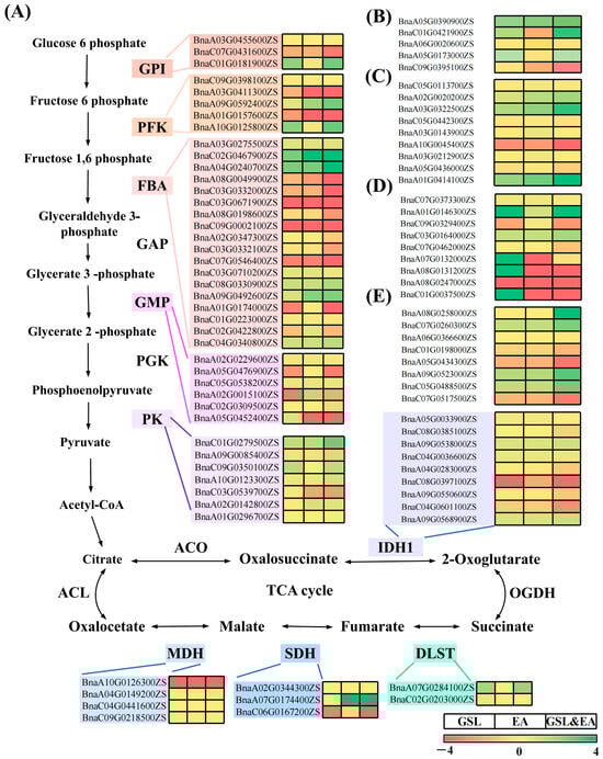 Representative DEGs involved in GSL-, EA-, and GSL–EA-related pathways; (A) glucose-; (B) myrosinase-; (C) lipid-; (D) antioxidant-; and (E) hormonal metabolism-related genes.