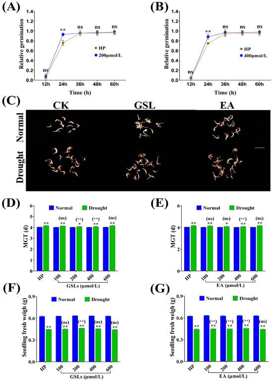 The influence of GSL and EA priming on (A,B) relative germination%, (C) seed germination phenomenon at 24 h of seed imbibition, (D,E) mean germination time, and (F,G) seedling fresh weight, respectively, in QY7 (LGLE) under normal and drought stress conditions during the germination and early seedling stage. Bars represent ±SE of three replicates. Asterisks indicate significant differences between drought and normal conditions, while asterisks with parentheses indicate significant differences between HP and different concentrations under drought conditions (ns: non-significant, * p < 0.05, ** p < 0.01; Student’s t-test).