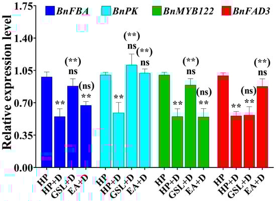 The influence of seed priming via 200 μmol/L of GSL and 400 μmol/L of EA on the relative expression gene in QY7 (LGLE) at 24 h of seed imbibition under drought stress conditions. Bars represent ±SE of three replicates. Asterisks indicate significant differences between hydro-priming (HP) under normal conditions and treatment under drought conditions, while asterisks with parentheses indicate significant differences between HP and other treatments under drought conditions (ns: non-significant, ** p < 0.01; Student’s t-test).