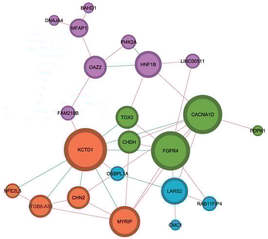 4.3. Network Analysis of Genes with Statistical Significance for Survival