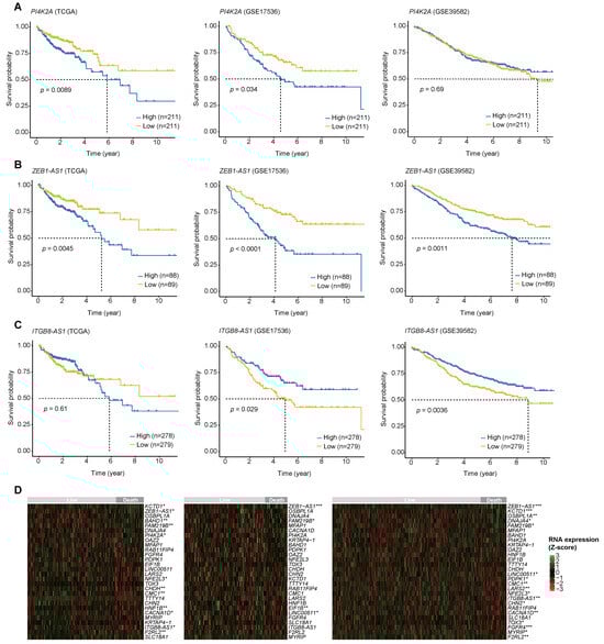 | Gene Symbol (Probe Name) | TCGA-COAD (n = 422) | GSE17536 (n = 177) | GSE39582 (n = 557) | |||