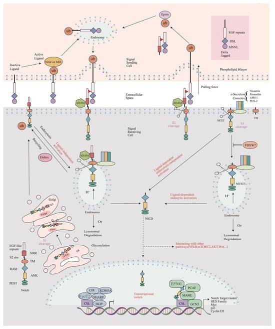Major components and auxiliary factors of the Notch signaling pathway (modified from [6]). In signal-receiving cells, Notch receptors are first synthesized in the endoplasmic reticulum and then translocated to the Golgi apparatus, where EGF-like repeat sequences undergo glycosylation modification during translocation. The Notch receptor then undergoes S1 cleavage in the Golgi to form a heterodimer and is transported to the cell membrane. In the presence of ubiquitin ligase, some Notch receptors on the cell membrane are endocytosed into the nuclear endosome, which has an acidic environment and contains ADAMs and γ-secretase. Notch receptors in endosomes have two fates, they can either be recirculated to the cell membrane and cleaved to the NICD (the E3 ubiquitin ligase Deltex acts as an activator of Notch, capable of upregulating Notch), or they are translocated to lysosomes for degradation. In signaling cells, the Notch ligand is inactive at the cell membrane, and after Neur or Mib ubiquitination, the ligand is activated and a Notch signaling cascade occurs (ligand–receptor binding indicated by bright red triangles). The ligand can then be endocytosed and the accompanying pulling force induces traction of the bound ligand and receptor toward the side of the signaling cell. In the absence of traction, the S2 site of the Notch receptor is masked by the NRR, and with increasing traction, the S2 cleavage site is exposed, allowing for a second cleavage to occur. ADAMs are indispensable for S2 cleavage. The product of Notch undergoing S2 cleavage is NEXT, which also has two fates, either remaining on the cell membrane and binding to γ-secretase to undergo a third cleavage (S3 cleavage) to produce the NICD, or endocytosis into the endosome and binding to γ-secretase on the membrane to undergo cleavage to produce either NICD or NEXT translocation to the lysosome for degradation. In total, there are three approaches to generate the NICD, which are classified as ligand-independent activation, ligand-dependent endocytosis-independent activation, and ligand-dependent endocytic activation. The resulting NICD can undergo phosphorylation modifications, leading to FBXW7-mediated NICD degradation. The NICD can translocate into the nucleus or remain in the cytoplasm to crosstalk with other signaling pathways such as NFκB, mTORC2, AKT, and Wnt. In the absence of the NICD, CSL binds to transcriptional repressors to inhibit the transcription of target genes. Once the NICD enters the nucleus, it can bind to CSL to recruit MAML, release transcriptional repressors, and recruit coactivators to promote the transcription of Notch target genes. The top right corner is the structural view of the ligand and the bottom left corner is the structural view of the receptor. NICD, Notch intracellular domain; ADAM, a disintegrin and metalloproteinase domain-containing protein; Neur, Neuralized; Mib, Mindbomb; NRR, negative regulatory region; NEXT, Notch extracellular truncation; CSL, Rbpj/Su(H)/Lag1; MAML, Mastermind-like proteins; TM, transmembrane domain; RAM, RBPJ association module; ANK, ankyrin repeats; PEST, proline/glutamic acid/serine/threonine-rich motifs; NLS, nuclear localization sequence; KyoT2/CIR/SHARP/SKIP/KDM5A, transcriptional repressor; EP300/MAML/PCAF/GCN5, transcription activator.