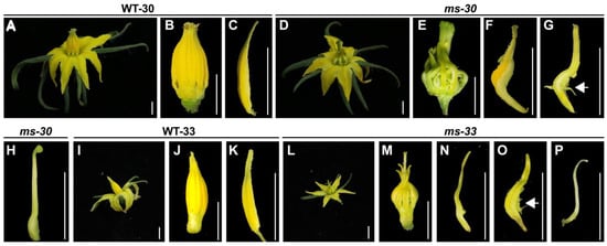 Phenotypes of flowers and stamens in ms-30 and ms-33. (A) Flower, (B) anther cone, and (C) dissected stamen in WT-30. (D) Flower and (E) anther cone in ms-30. (F) Dissected stamen with carpelloid structures in ms-30. (G) Dissected stamen with carpelloid structures and external ovules in ms-30; white arrow denotes the external ovules. (H) Completely carpelloid stamen in ms-30. (I) Flower, (J) anther cone, (K) and dissected stamen in WT-33. (L) Flower and (M) anther cone in ms-33. (N) Dissected stamen with carpelloid structures in ms-33. (O) Dissected stamen with carpelloid structures and external ovules in ms-33; white arrow indicates the external ovules. (P) Completely carpelloid stamen in ms-33. The white bar indicates 0.5 cm.