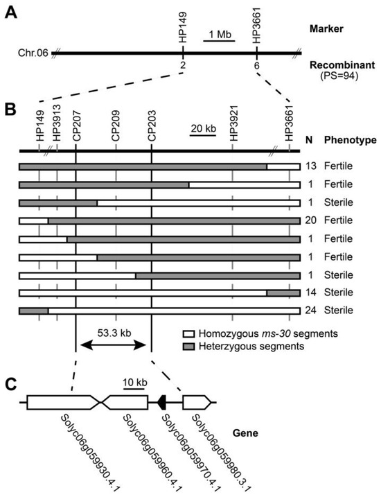 For preliminary mapping of the ms-30 and ms-33 loci, markers located on chromosome 6 were utilized. This approach was based on prior reports indicating that ms-33 is located on chromosome 6 of tomato. Furthermore, the ms-30 and ms-33 mutants exhibited similar phenotypes, suggesting a potential linkage (Figure 1 and Figure S1; Table S1) [30,31,33,35,36]. In this preliminary mapping phase, 94 male sterile plants from each F2 population were genotyped, and their recombination rates were calculated. As anticipated, the findings confirmed that both ms-30 and ms-33 are located within the region bounded by markers HP149 and HP3661 on chromosome 6 (Figure 2A and Figure S2A). To further narrow down the locations of these loci, 76 and 39 recombinants were selected from the entire F2 populations of ms-30 and ms-33, respectively, and genotyped with additional markers. This detailed analysis allowed the ms-30 locus to be narrowed down to a 53.3 kb region, delimited by the markers CP207 and CP203 (Figure 2B). Similarly, the ms-33 locus was confined to an interval of 111.2 kb, defined by markers CP207 and HP3921 (Figure S2B). Notably, both loci shared an identical 53.3 kb region.