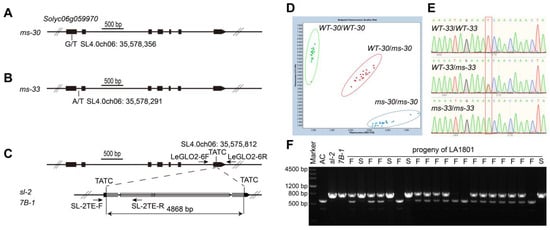 Pucci et al. (2017) [25] reported that the primer pair LeGLO2-6F/R did not amplify the last exon and part of the 3’ UTR region of the TPI gene in 7B-1 and sl-2. To investigate sequence variation in this region, PCR amplification was conducted using the LeGLO2-6F/R primer pair with an extended elongation time. This method enabled the production of approximately 5000 bp long amplicons from both 7B-1 and sl-2 (Figures S4B and S5). Sequencing of these amplicons showed no sequence variations. However, a fragment of 4868 bp in the amplicon was identified as a Copia-like retrotransposon, featuring a 398 bp long terminal repeat (LTR) sequence and a 4 bp target site duplication (TSD) sequence (Figure 3C and Figure S5). Based on the SNPs in the TPI gene of ms-30 and ms-33 and the LTR retrotransposon insertion in the TPI gene of 7B-1 and sl-2, three codominant markers were developed, namely a Kompetitive Allele Specific PCR (KASP) marker, MS30KASP; a sequence marker, MS33SEQ; and an Insertion/Deletion (InDel) marker, LeGLO2-6/SL-2TE (Figure 3D–F).
