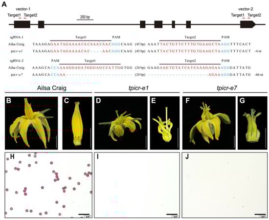To confirm that the TPI gene confers the phenotype observed in ms-30 and its alleles, the TPI gene was knocked out using the CRISPR/Cas9 system, and allelism tests were conducted between the ms-30 and TPI gene-edited mutants. Two vectors were designed to disrupt the TPI gene, with target sites on the first and last exons for vector-1 and vector-2, respectively. This resulted in two null mutants of the TPI gene. The tpicr-e1 mutant exhibited a 4 bp deletion, whereas tpicr-e7 had a 66 bp deletion (Figure 4A). The stamens of both tpicr-e1 and tpicr-e7 mutants showed curling, wrinkling, greenish coloration, and were incapable of producing viable pollen (Figure 4B–J), similar to phenotypic traits observed in the ms-30 and ms-33 mutants. Allelism tests between tpicr-e1, tpicr-e7, and ms-30 indicated that they were allelic (Table S3). These findings support the conclusion that TPI is responsible for the observed phenotypes in ms-30 and its alleles, including ms-33, 7B-1, and sl-2.
