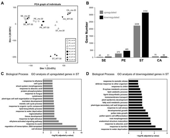 Loss of function of TPI in ms-30 affects multiple biological processes during stamen development. (A) Principal component analysis of RNA-seq data. (B) The number of differentially expressed genes that were upregulated and downregulated in SE, PE, ST, and CA. (C) Gene ontology (GO) enrichment analysis of upregulated differentially expressed genes in ST. (D) GO enrichment analysis of downregulated differentially expressed genes in ST. SE, Sepals; PE, Petals; ST, Stamens; and CA, Carpels.