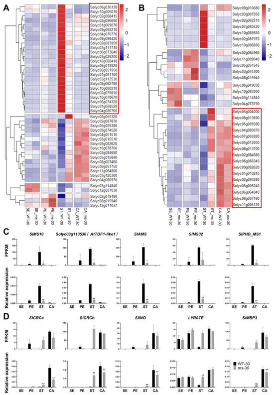 Expression pattern of the DEGs related to stamen or carpel development between WT-30 and ms-30. (A) Heatmap of the DEGs whose homologs in Arabidopsis are related to stamen development. The genes in the red box represent those expressed mainly in the stamen of WT-30 and significantly downregulated in the stamen of ms-30. (B) Heatmap of DEGs whose homologs in Arabidopsis are related to carpel development. Genes in the red box represent those mainly expressed in the carpel and significantly upregulated in the stamen of ms-30. (C,D) FPKM and qRT-PCR analysis of the DEGs related to stamen and carpel development in four floral organs of ms-30. Asterisks indicate a significant difference (**, p < 0.01) between WT-30 and ms-30; WT-30 and ms-30 are homozygous male fertile plants and male sterile plants derived from the tomato line 2-455, respectively. SE, sepals; PE, petals; ST, stamens; and CA, carpels.