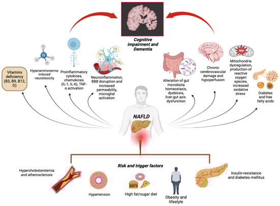 Insulin resistance is a critical factor in NAFLD, leading to disrupted brain insulin signaling and contributing to neurodegeneration, including Alzheimer’s disease (AD). The resistance impairs insulin/IGF-I mediated neuroprotective pathways, exacerbating cognitive decline. NAFLD patients, particularly those with T2DM and the ApoE-ε4 allele, experience altered BBB permeability, exacerbating CNS conditions. Systemic inflammation in NAFLD is characterized by high levels of proinflammatory biomarkers, contributing to neuroinflammation, endothelial dysfunction, and cerebral hypoperfusion, together with cardiovascular risk factors. The gut–liver–brain axis shows that gut dysbiosis in NAFLD impacts metabolic and cognitive functions, suggesting a link between microbiota and neurodegenerative diseases. Hyperammonemia due to NAFLD leads to neurotoxicity through increased BBB permeability and astrocytic swelling. Imbalances in FFA metabolism associated with NAFLD are risk factors for neurodegenerative and cardiovascular diseases, influencing brain health. Vitamin A, B, and D deficiencies in NAFLD patients impact brain development, function, and inflammation, linking to cognitive disorders and neurodegeneration. This integrated perspective highlights the importance of addressing metabolic dysfunctions to mitigate neurodegenerative diseases.