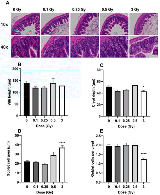 Representative H&E-stained sections of the ileum at each dose at 10× and 40× magnification (A). Villi height (B), crypt depth (C), goblet cell area (D), and quantity of goblet cells (E) are shown at 48 h post exposure. An average of 24 villi and 103 crypts were scored per mouse. Bars represent the mean ± SEM across replicate animals (n = 5–12 per treatment). Data were analyzed using a one-way ANOVA followed by Tukey’s post hoc test. Symbols indicate statistical significance compared to 0 Gy control: * p ≤ 0.05, **** p ≤ 0.0001.