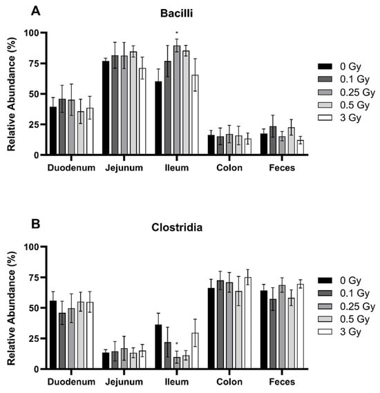 Descending through taxonomic ranks of the class Bacilli, the bacterial orders Erysipelotrichales (Figure 4A) and Lactobacillales (Figure 4B) were analyzed. Ionizing radiation significantly impacted the relative abundance of both orders. Irradiation increased the abundance of Erysipelotrichales in the jejunum (0.5 and 3 Gy) and the ileum (0.25, 0.5, and 3 Gy) by approximately 3–4-fold (Figure 4A). In contrast, high-dose irradiation decreased the abundance of Lactobacillales in the jejunum (0.5 and 3 Gy) and the ileum (3 Gy) by 2–4-fold (Figure 4B).