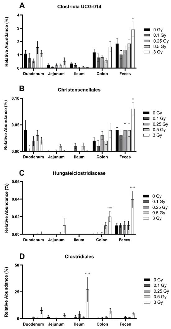Next, the class Clostridia was analyzed in more depth. In contrast to Bacilli, where radiation effects were concentrated within the small intestine, Clostridia was primarily impacted in the distal GIT. Within the feces, the orders Clostridia UCG-014 (Figure 5A), Christensenellales (Figure 5B), and Hungateiclostridiaceae (Figure 5C) were significantly increased after a dose of 3 Gy by 1–6-fold. In Hungateiclostridiaceae, this same dose also increased bacterial abundance in the colon. A different response was seen in the order Clostridiales. Here, the colon and feces were minimally impacted; however, a dose of 3 Gy produced a large increase in ileal abundance by 249-fold (Figure 5D).